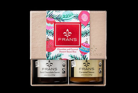 An elegant duo of best-selling dessert sauces including one jar of Dark Chocolate Sauce and one jar of Caramel Sauce.