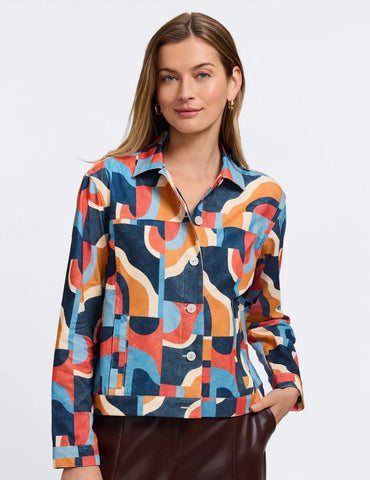 Corduroy jacketStand out in style with this abstract shirt jacket, a bold layering piece designed to elevate any outfit. Crafted from soft fine-wale corduroy, this lightweight jacket features a vibrant geometric print in shades of navy, orange, red, and blue for a retro-inspired yet modern look. Button-front closure, collared neckline, and relaxed silhouette,
