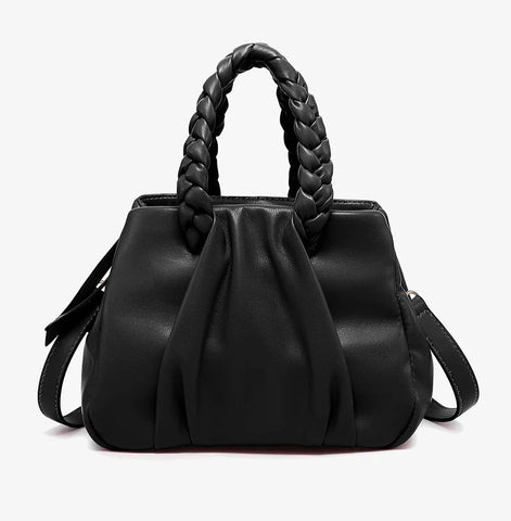 Black vegan leather with a soft, gathered texture and ruched braided dual handles has top zip closure, interior slip and zip pockets and removable crossbody strap