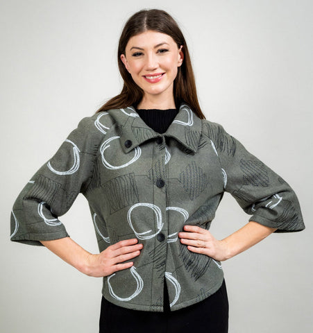 Swing jacketElevate your wardrobe with this modern swing jacket, designed in a chic cropped silhouette that flatters effortlessly. The oversized collar adds a touch of drama and sophistication, while the wide 3/4 sleeves bring ease and comfort to every movement. Crafted in a soft olive fabric with abstract stitched patterns.